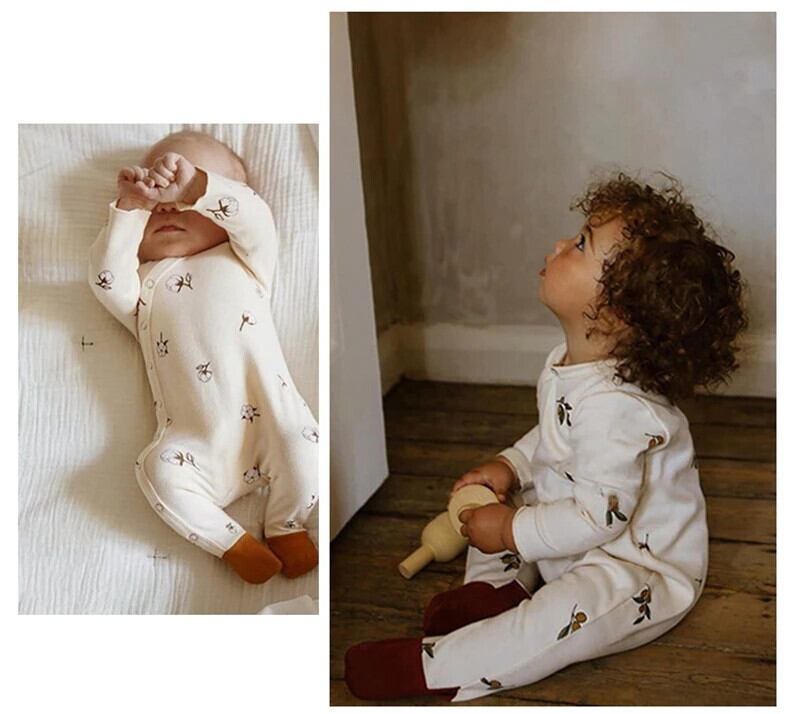 新生児服付き帽子プリントベビーフットジャンプスーツロンパース長袖幼児男の子女の子春底入れジャンプスーツ ロング スプリング 春物