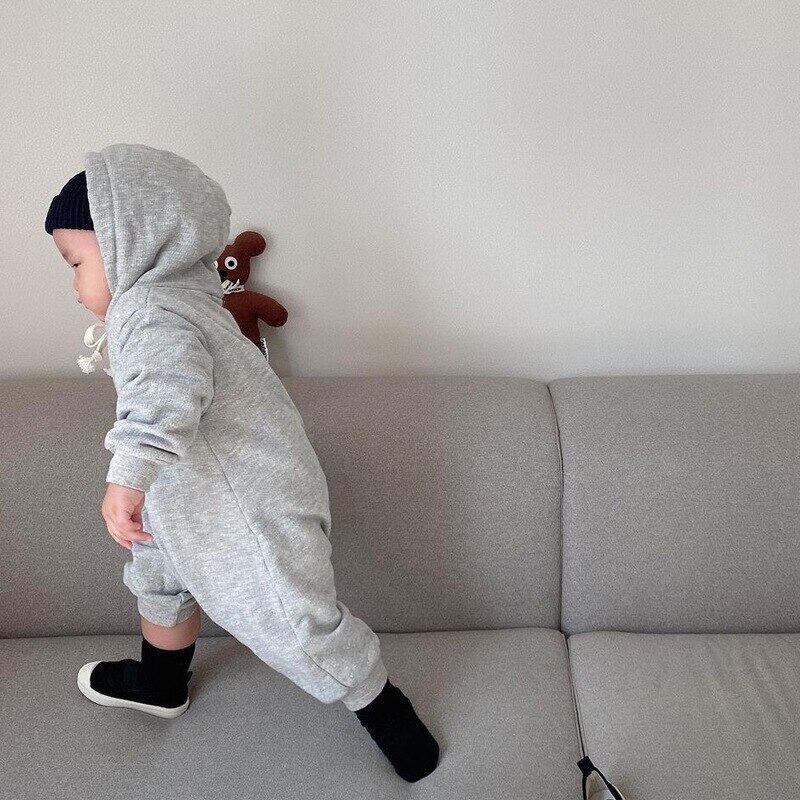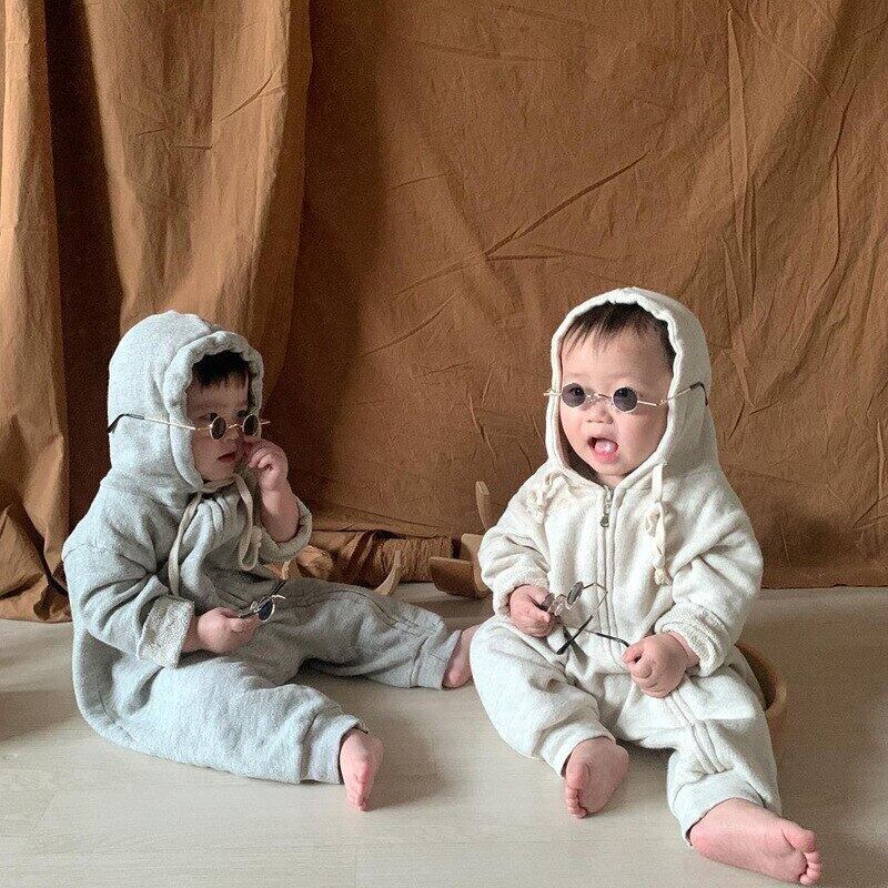 秋のベビーロンパース無地長袖幼児フード付きジャンプスーツ新生児少年少女の綿の服 ロング コットン オータム 秋物 ソリッドカラー