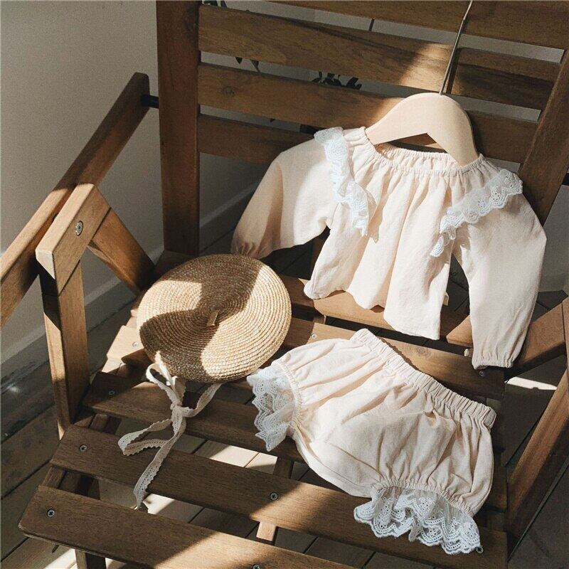 女の赤ちゃん服セット幼児女の赤ちゃんドレス綿ソフトレースフリル長袖ブラウストップス + ショーツ衣装スーツ ロング コットン ラッフル ブルマー