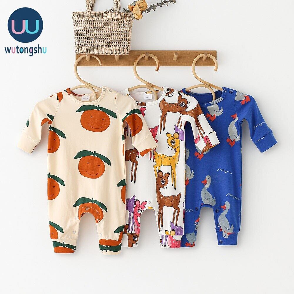 ベビーロンパース女の子 0-24M 印刷ソフトコットン長袖ベビーワンピース無地生まれの男の赤ちゃん服 ロング ソリッドカラー