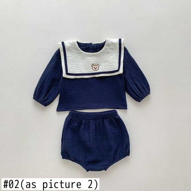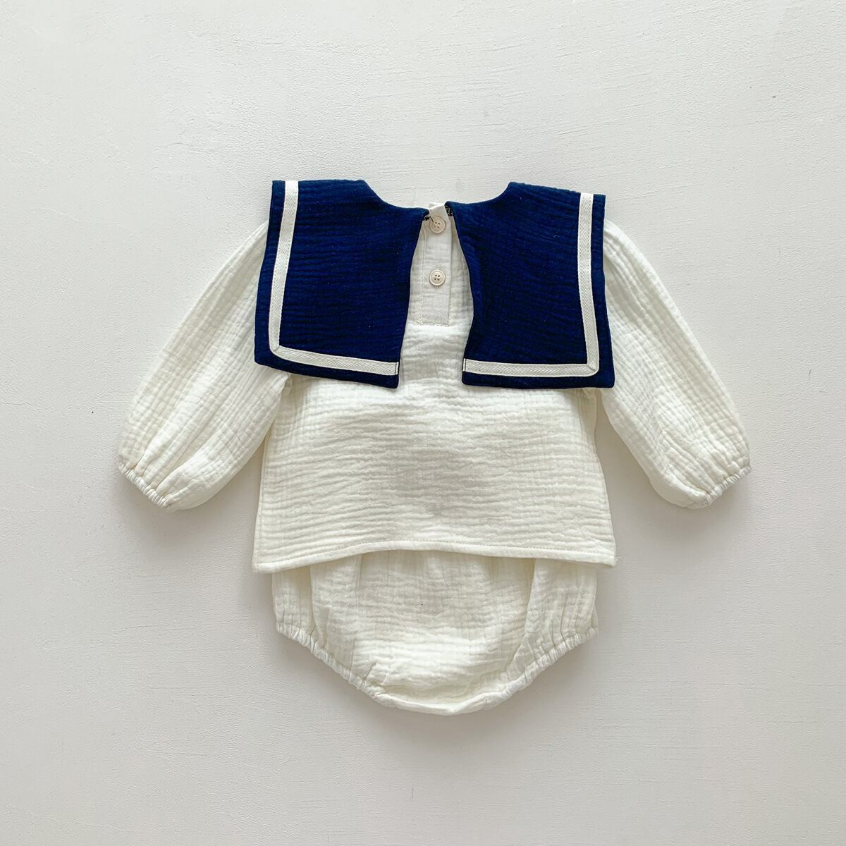 新生児男の子服 2点セット オーガニックコットン ネイビー ラペルスタイル 長袖 シャツトップ + パンパンツ ベビー ロング