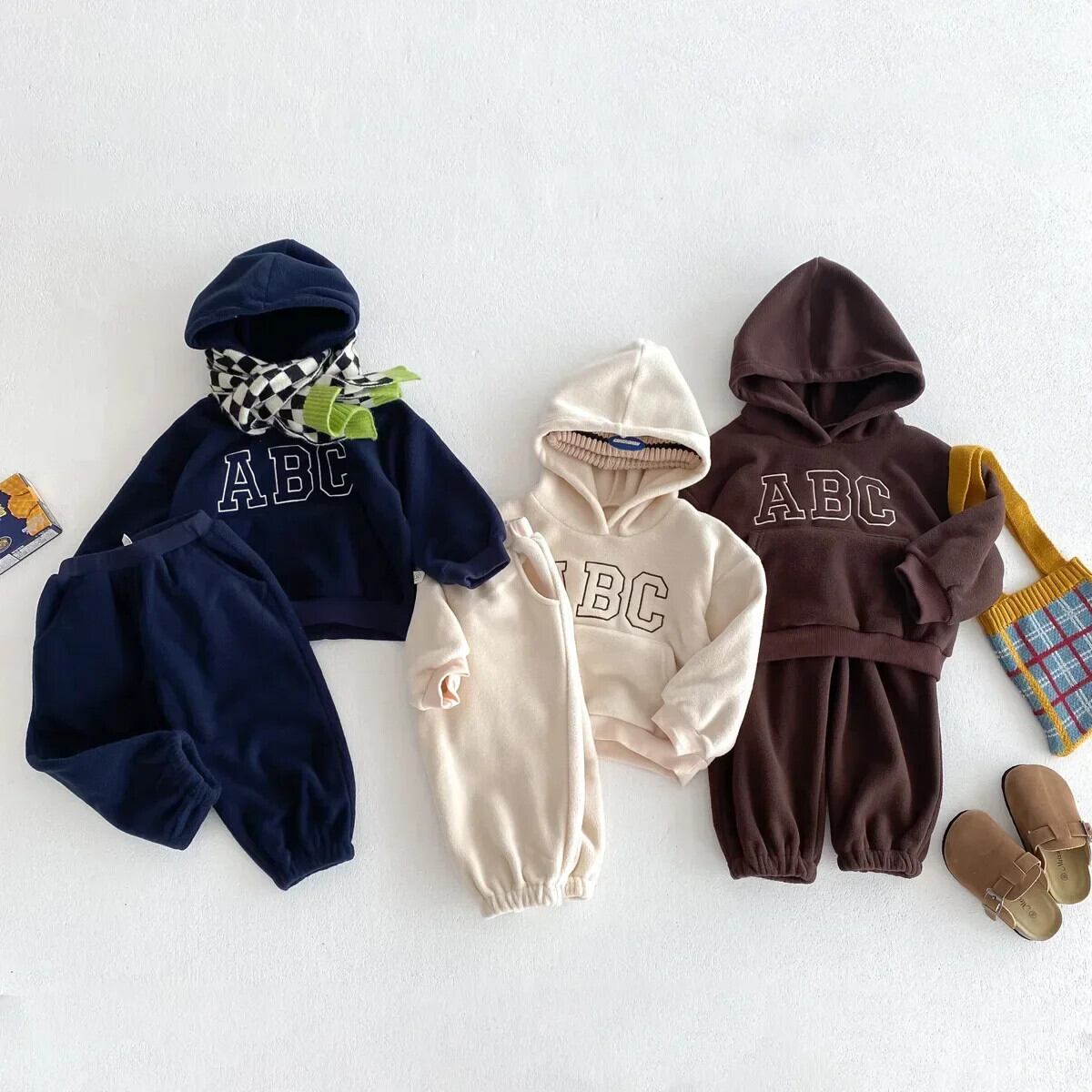 秋冬ベビーレターフリース厚みパーカースーツ少年少女子供プラスベルベット暖かいトップス + パンツ 2 個 オータム 秋物 ウィンター 冬物 ソリッドカラー